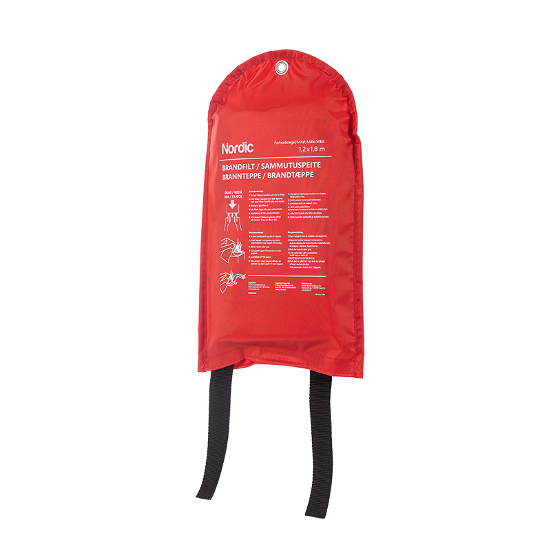Brandfilt Nordic – 4-språkig (SE, FI, NO, DK) med mjuk väska.