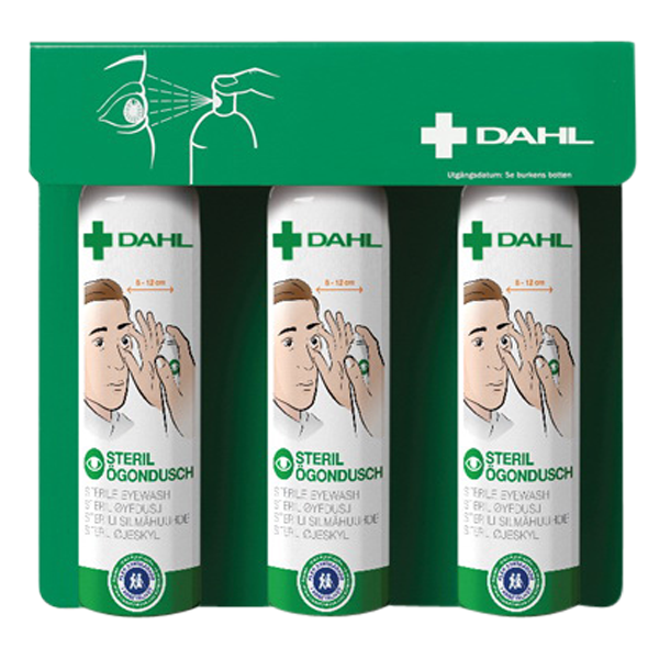Dahl Ögonduschställ 3×200 ml är en lättillgänglig akutberedskap för ögonspolning med total spoltid om ca 21 min.