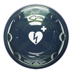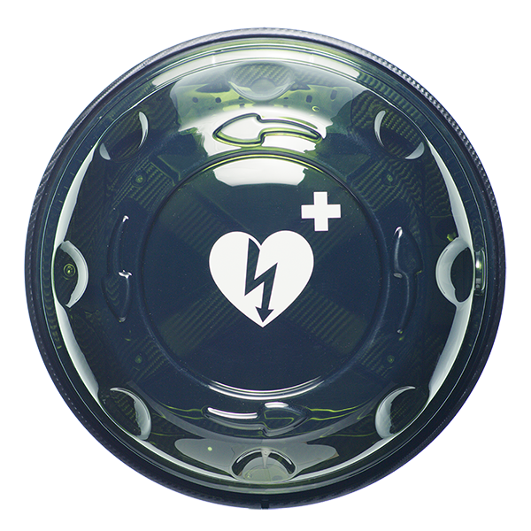 Kåpan är tydligt uppmärkt med symbol för hjärtstartare och pilar för snabb och enkel access till hjärtstartaren.