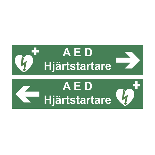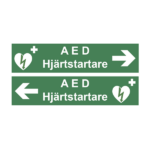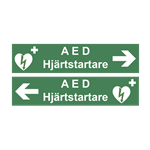Nödskylt med text “AED/Hjärtstartare”, dubbelsidig med hänvisningspil höger eller vänster.